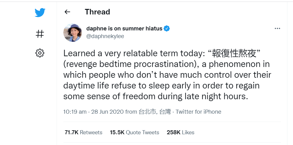 The term has its roots in the Chinese language where it was called “bàofùxìng áoyè,” the earliest usage of which can be found in a 2018 blog post by a man from Guangdong province in China. In his blog, he complains about belonging to someone else during the day and finding relief from the mundane only at night when he is back home and can lay relaxed in his bed. Reading a translation of his post in English helps us understand how nighttime is a metaphor for freedom and joy in his life.